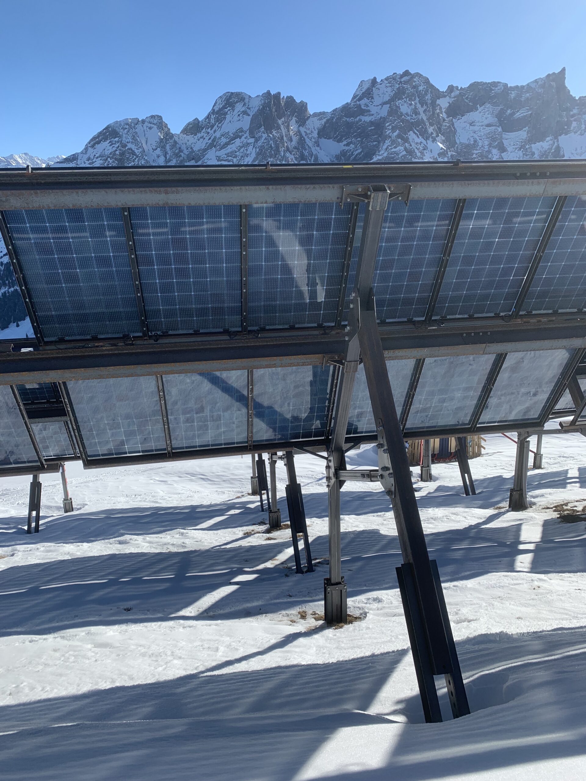 Das sah so aus: Ein Skifahrer am sünnelä – auf einer Schneepfütze, umrundet von Alpin-Solar Panels. Dass das in den Alpen ist, ist offensichtlich. Wo sonst? Diese Anlagen sollen, wenn es nach den EW’s geht, wie Pilze aus dem Boden schiessen!